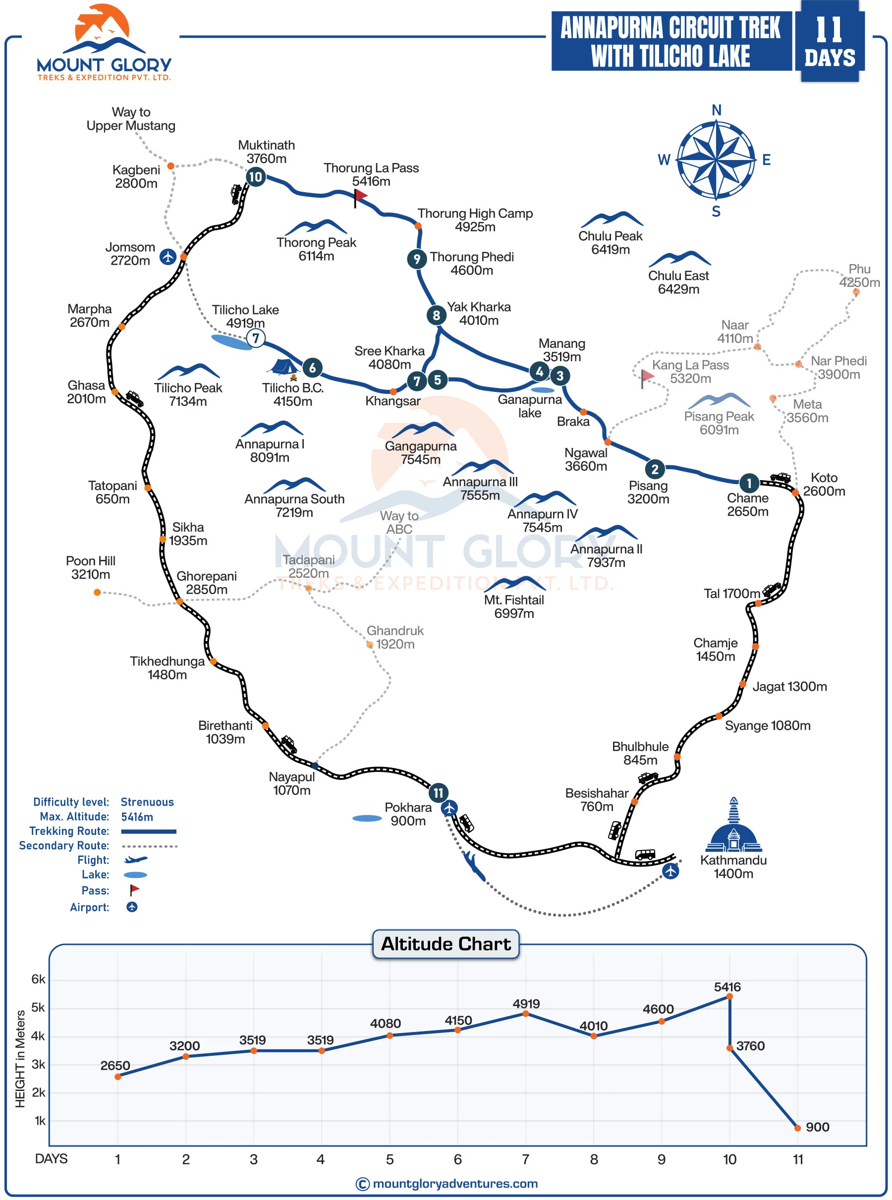 - The route offers breathtaking views of Tilicho Peak, Dhaulagiri, Gangapurna, and Annapurna II, III, and IV.