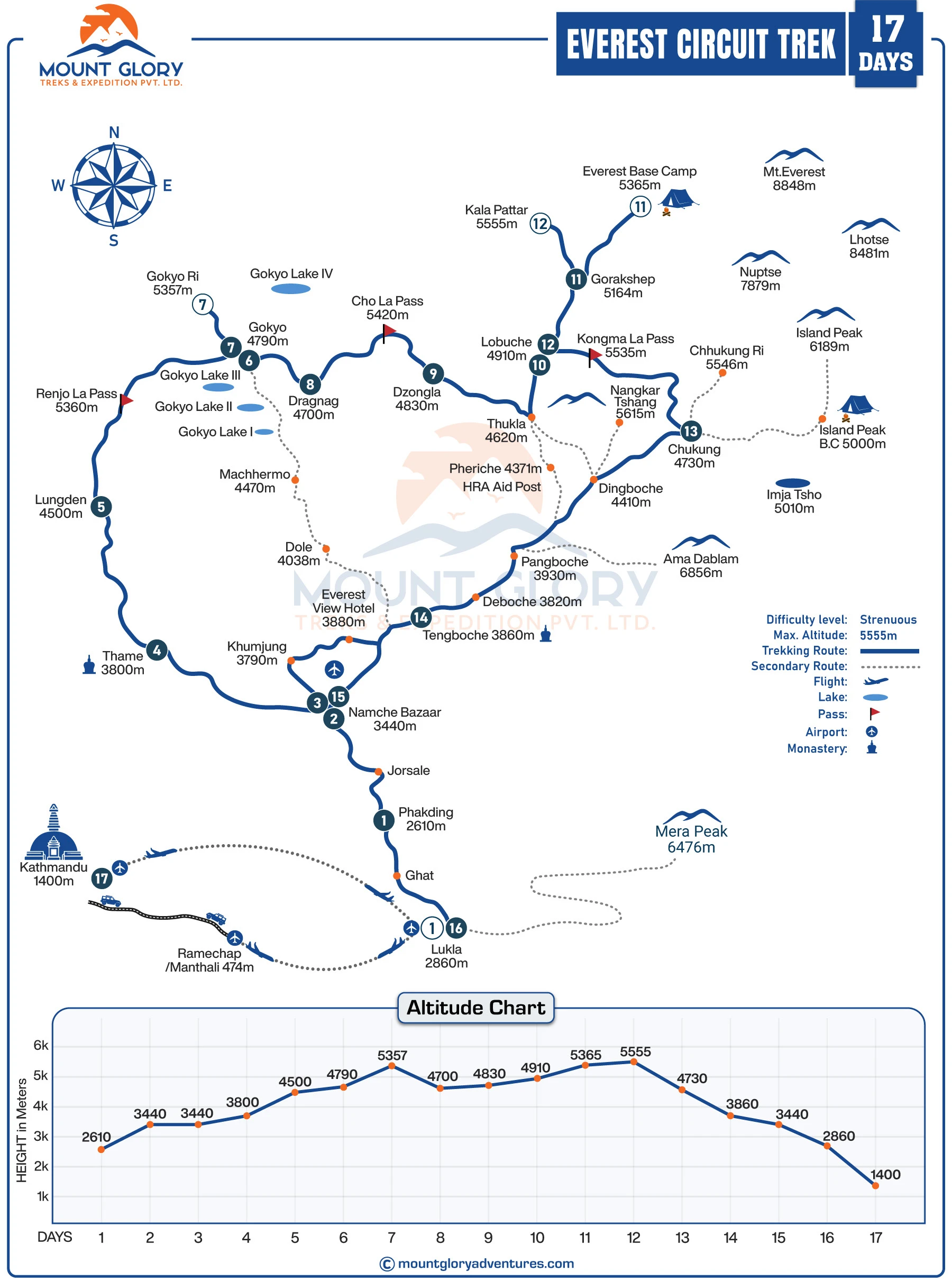 The Everest Circuit Journey starts and ends from the gateway Lukla 2840 m which is one of the world's most adventurous thrilling flights. we will follow along the Dudh Khosi river floor, passing through farming villages of many mixed religious communities. After many days of trek, we will arrive at the base camp of the world's highest peak Mount Everest. This journey is clockwise or anti-clockwise. Mount Glory Treks designed the clockwise Everest Circuit Trekking 17 days itinerary based on the trekker’s satisfaction. But it is possible to do the anti-clockwise route as well.