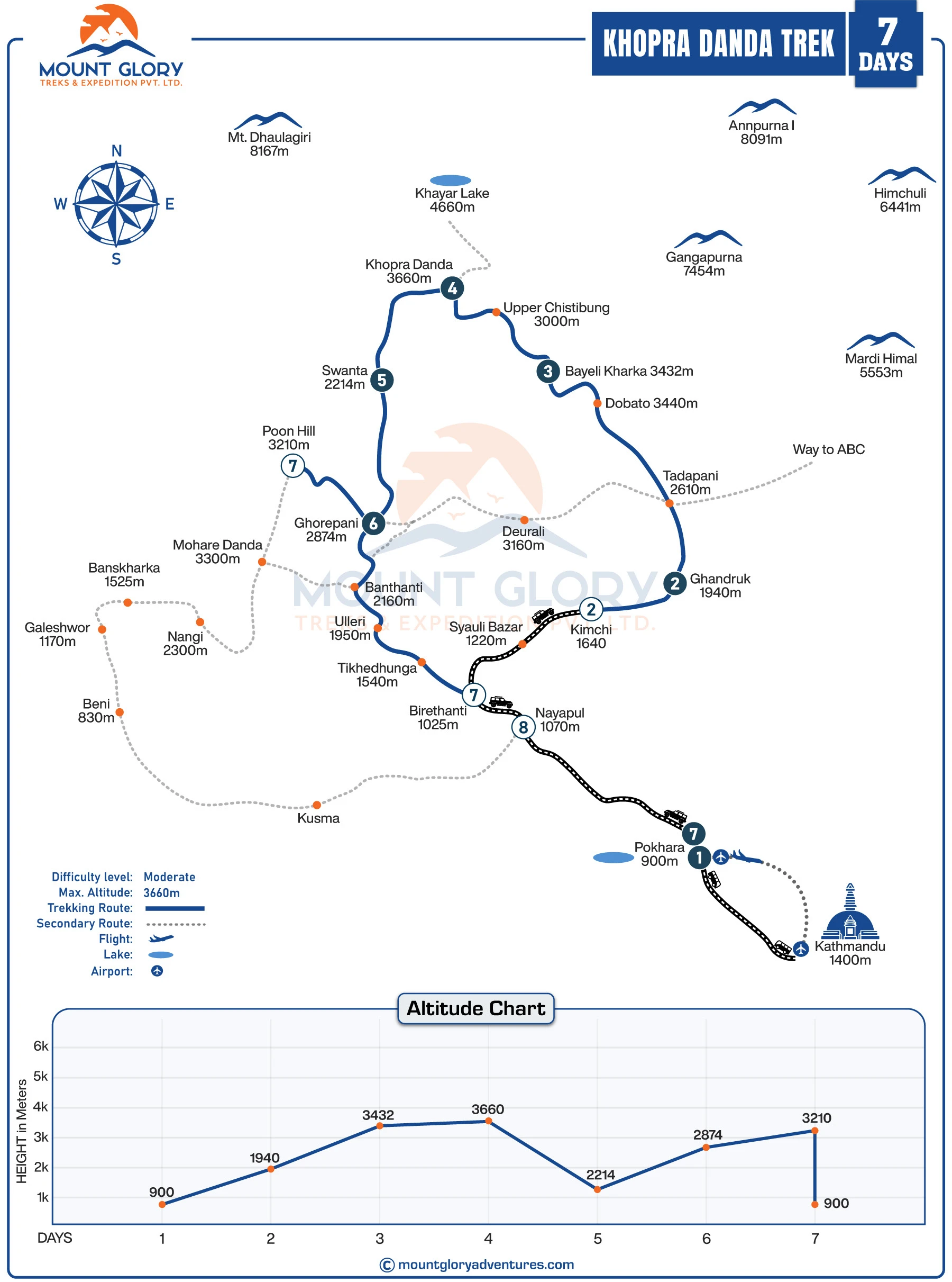 Mount Glory Treks organize this amazing Khopra Danda Trek or Khopra Ridge Trek Journey from Kathmandu which is included with another most popular trek in Annapurna Region Poon Hill Trek overall in 7 Days with affordable group breakdown cost.
