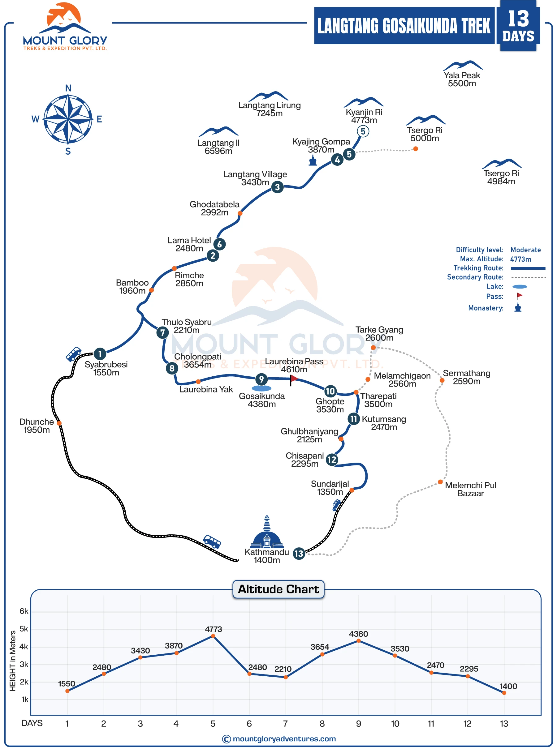 The Langtang Gosaikunda Lake Trek 13 Days Itinerary begins with a picturesque drive from Kathmandu to Syabrubesi, the entrance to the Langtang region, which passes through villages, hills, rivers, and rural areas.