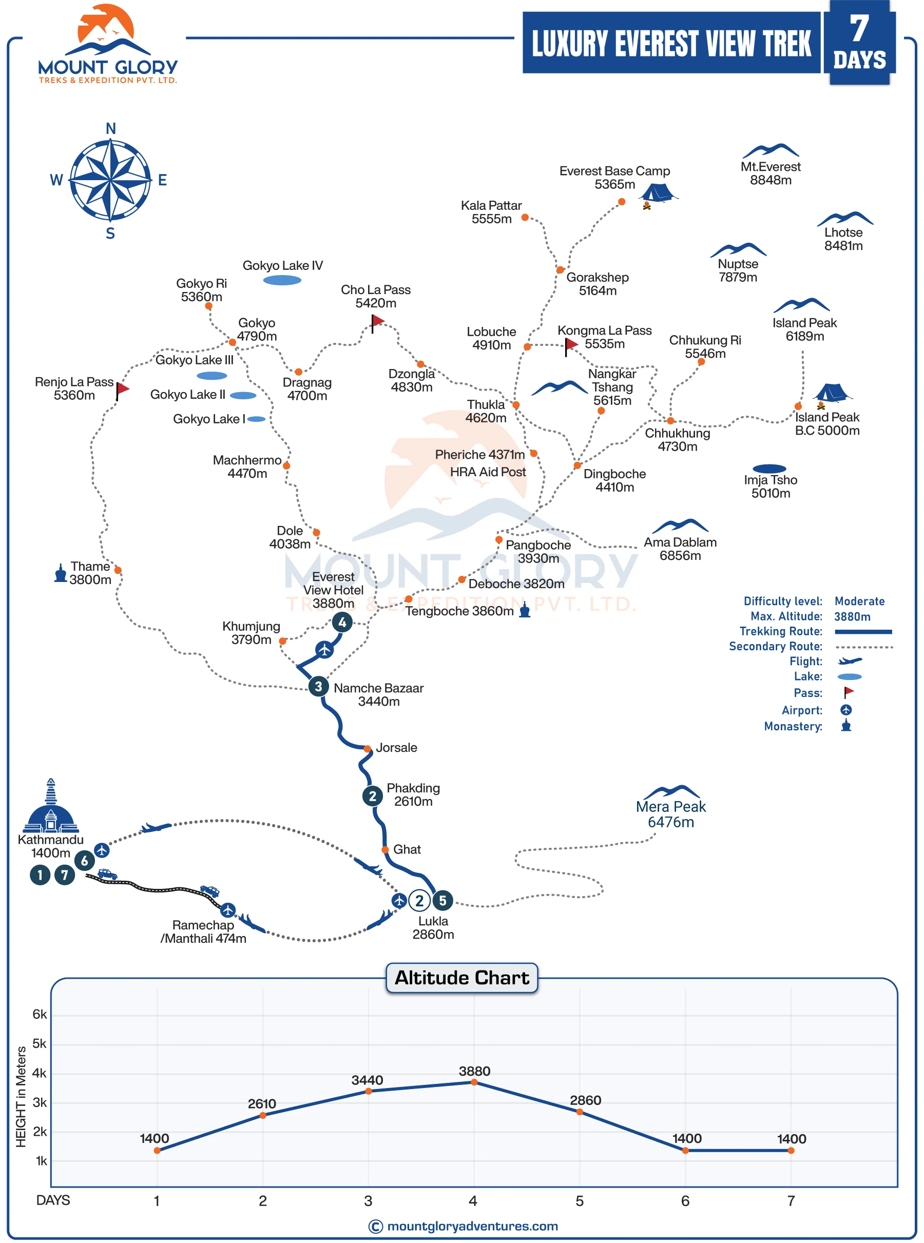 The Everest View Luxury Trek altitude range is 2,800 m - 3,880 m, which is considered moderate and widely available. Luxury Everest Trekking can be completed in a flexible time frame of approximately 7 days from arrival in Nepal to final departure.